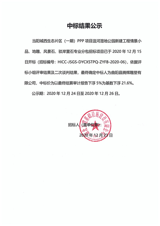 沮河湿地公园新建工程情景小品、地雕、风景石、驳岸置石专业分包中标结果公示