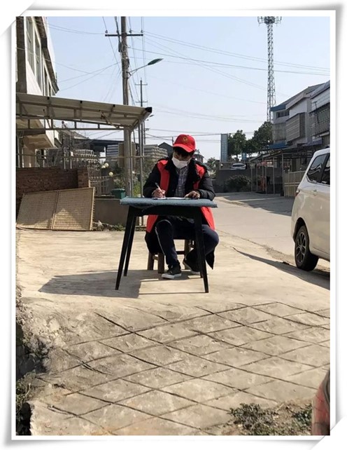 志愿者佘庆平在松滋市南海镇史家冲村进行交通管制通行情况登记