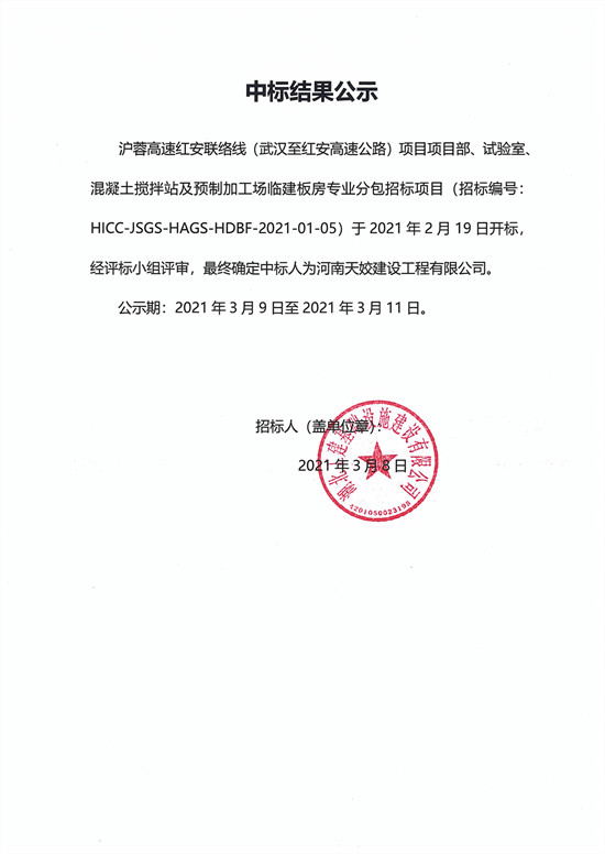 沪蓉高速红安联络线(武汉至红安高速公路)项目临建板房专业分包中标结果公示