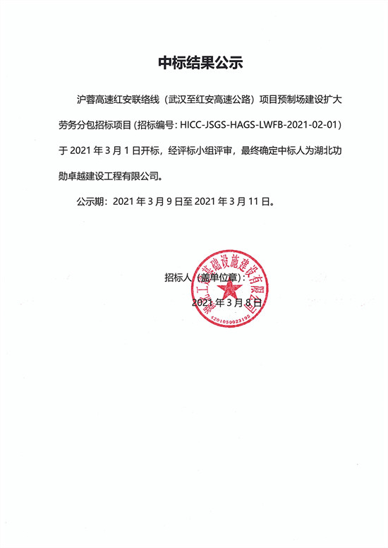 沪蓉高速红安联络线(武汉至红安高速公路)项目预制场建设扩大劳务分包中标结果公示