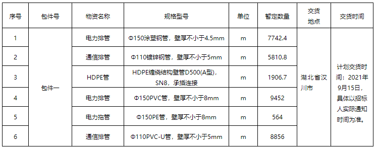 1.2招标内容:本次管材采购招标内容详见下表。