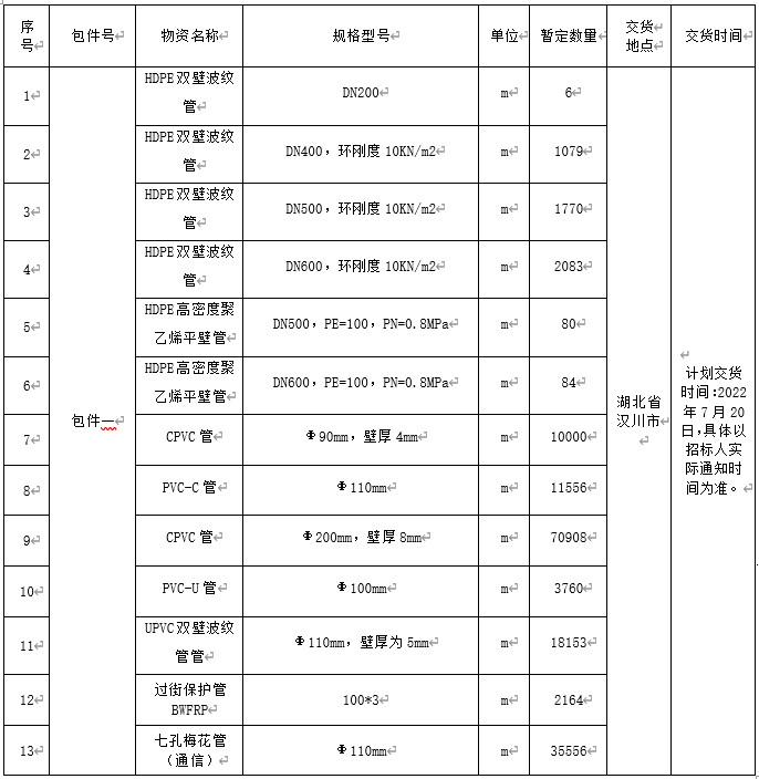 1.2 招标内容:本次管材采购招标内容详见下表。