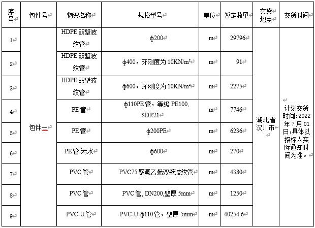 1.2 招标内容:本次管材采购招标内容详见下表。