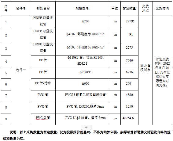 1.2 招标内容:本次管材采购招标内容详见下表。