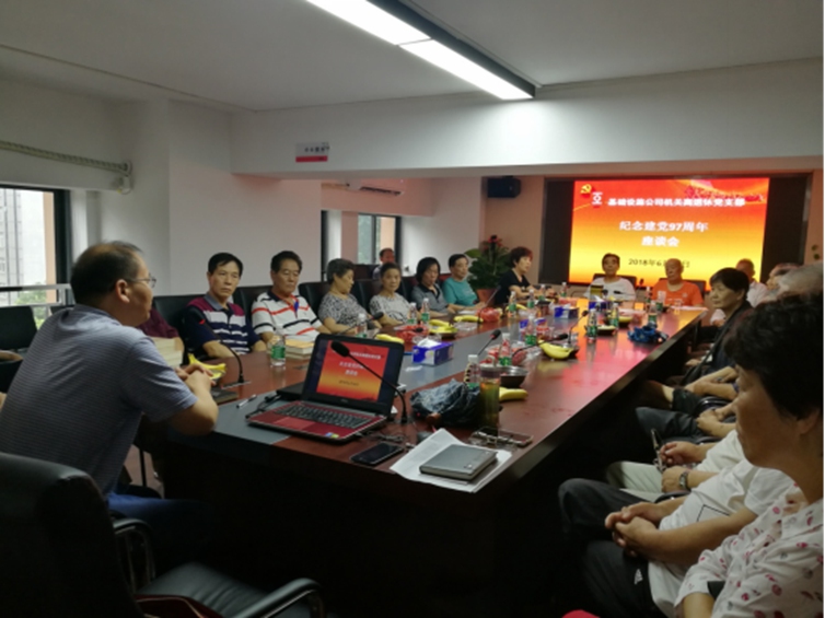 6月30日下午,基础设施公司机关离退休支部组织在汉离退休党员在新搬迁的办公楼会议室召开七一座谈会,公司党委书记肖中华参加座谈会。他对各位老同志冒雨参加纪念活动表示感谢,介绍了基础设施公司目前新党委和领导班子情况,对集团公司和基础设施公司近两年的生产经营状况和未来发展规划做了比较细致的介绍,并传达了集团党委书记刘光辉红安6.20讲话精神。随后,大家一起观看了集团公司企业宣传片。座谈会上几位老领导老党员纷纷对公司乔迁新居表示祝贺,并对公司现在取得的成绩表示赞赏,祝愿基础设施公司在集团公司党委和新任领导班子的带领下,取得更加辉煌的业绩。老同志们来到新办公楼非常高兴,在机关支部同志们的带领下,参观了各个科室办公环境。公司党群工作部还给各位老同志赠送了书籍《十堰文史·三线建设·“102”卷》。
